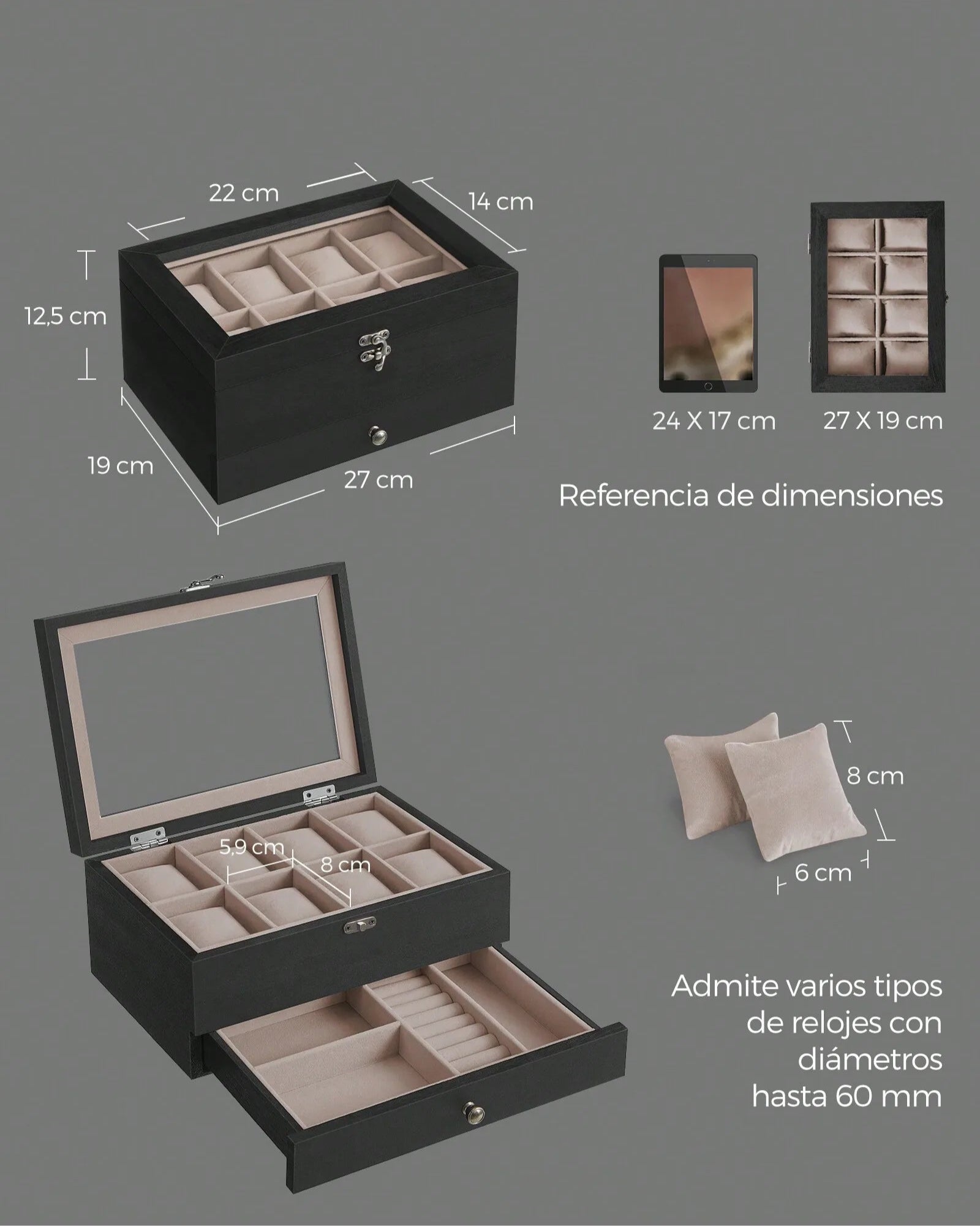 Spacious & Practical – Features 8 watch slots on the top and multiple compartments in the bottom drawer for bracelets, rings, and other jewelry.